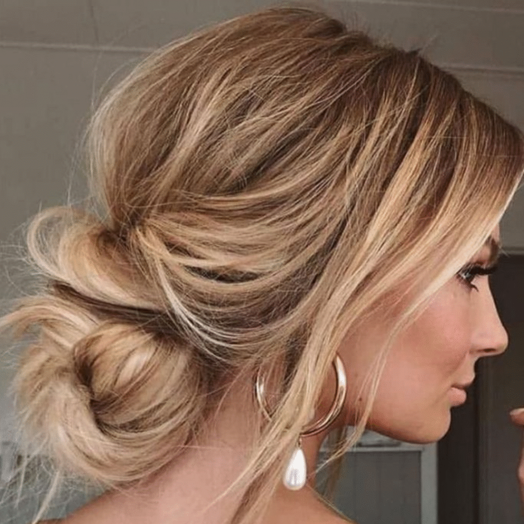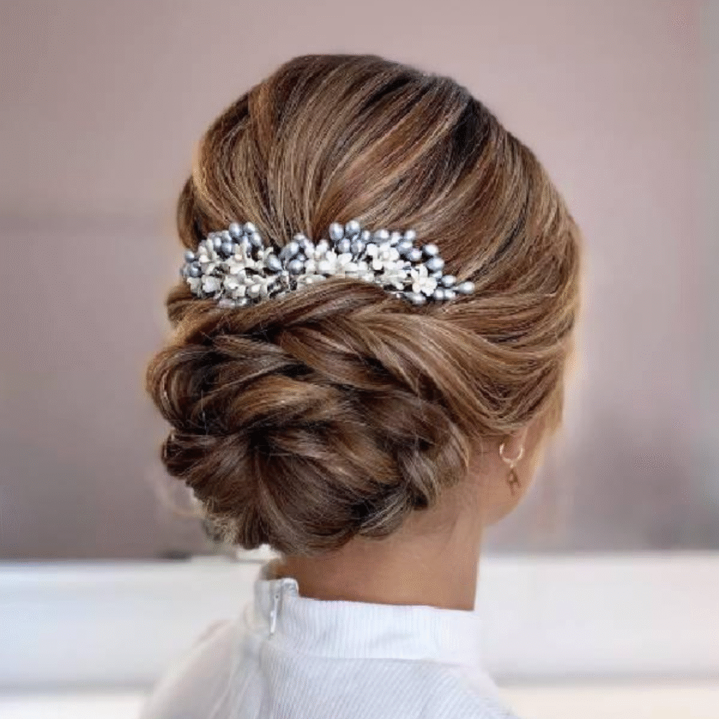 El recogido bajo es perfecto para bodas, eventos formales o ceremonias donde se busca una imagen sofisticada.