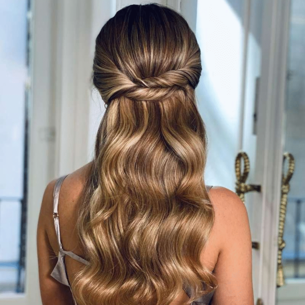 El semirrecogido aporta ligereza, movimiento y un aire romántico ideal para bodas al aire libre, celebraciones de día o looks más juveniles.